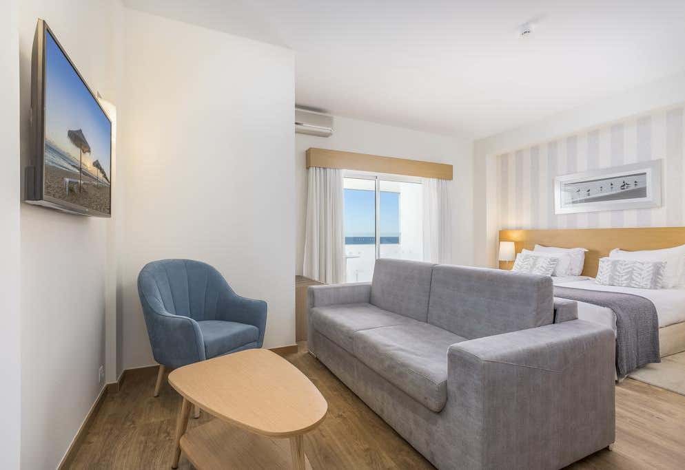The onsite restaurant is complete with a beautiful panoramic deck overlooking the sea, meaning it’s a treat for all the senses and not just your taste buds. The bar also has a terrace to make the most of, alongside an extensive cocktail list and both local and international drinks. Other facilities at the Dom José include a gym, massage room, a mini-golf course, and a large pool area featuring lots of sun loungers. The hotel’s beach area also comes with loungers and parasols, while the nearby surroundings are just as impressive with a water park, several golf course, and even a diving school within five kilometres.